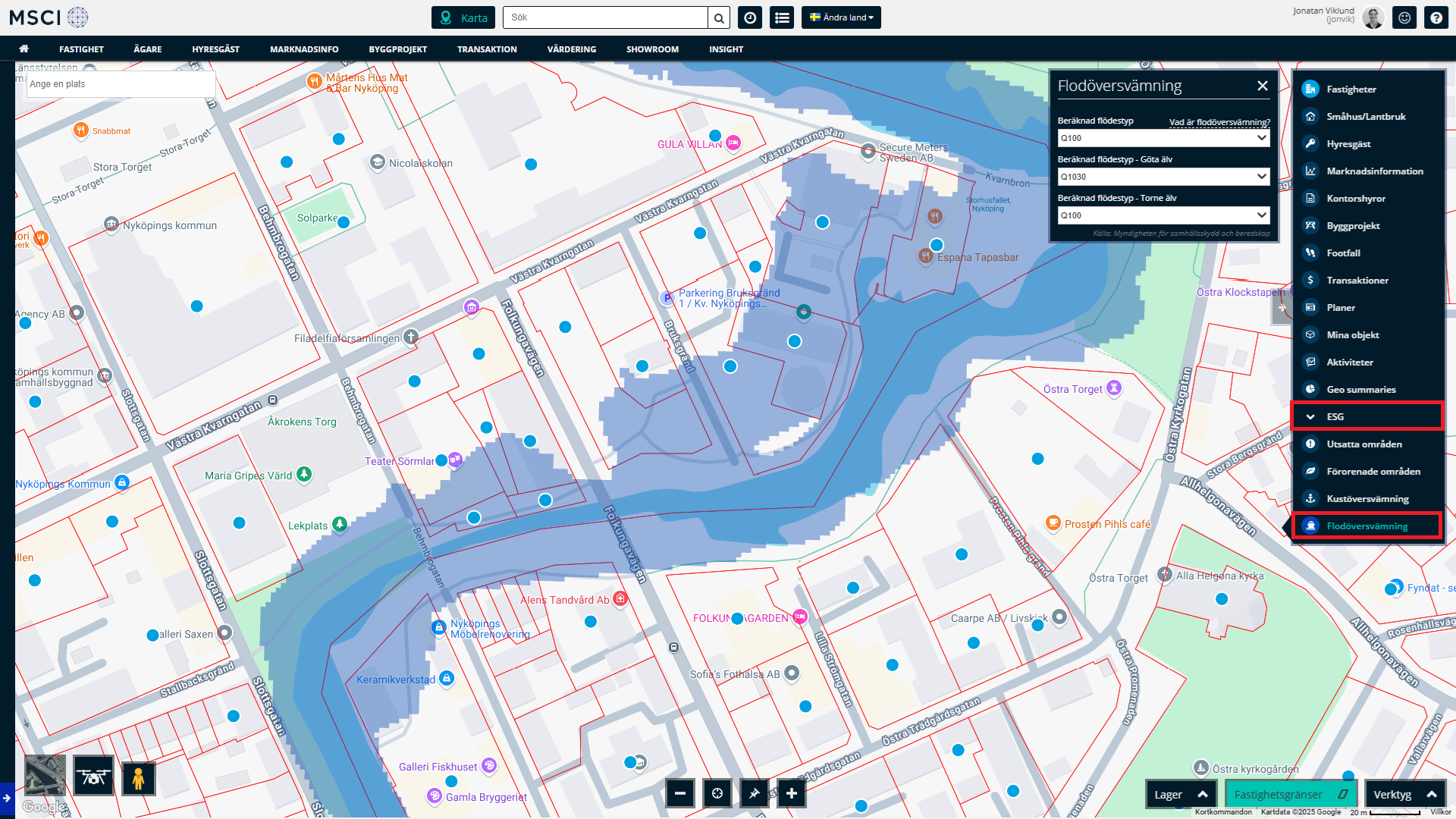 När du befinner dig i kartan, hittar du till höger en meny med olika moduler. Klicka på den generella ESG-tabben, så visas samtliga tre datalager: