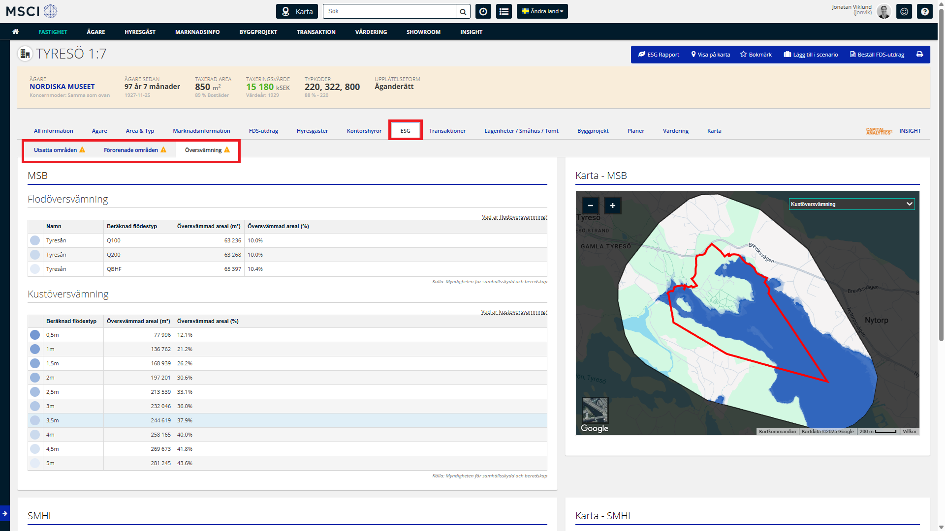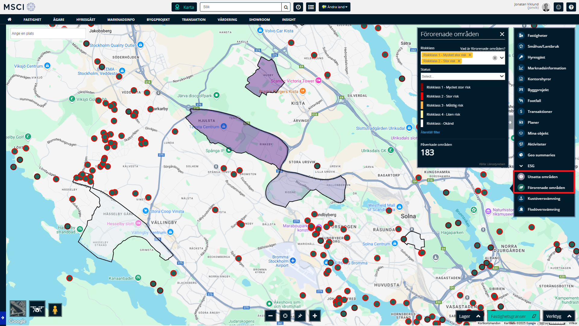 Navigera dig till ESG tabben till höger för att få tillgång till ESG information kopplat till fastigheten och dess omgivning. Här kan du välja mellan samtliga 3 moduler, Utsatta områden, förorenad mark och översvämningsrisker.