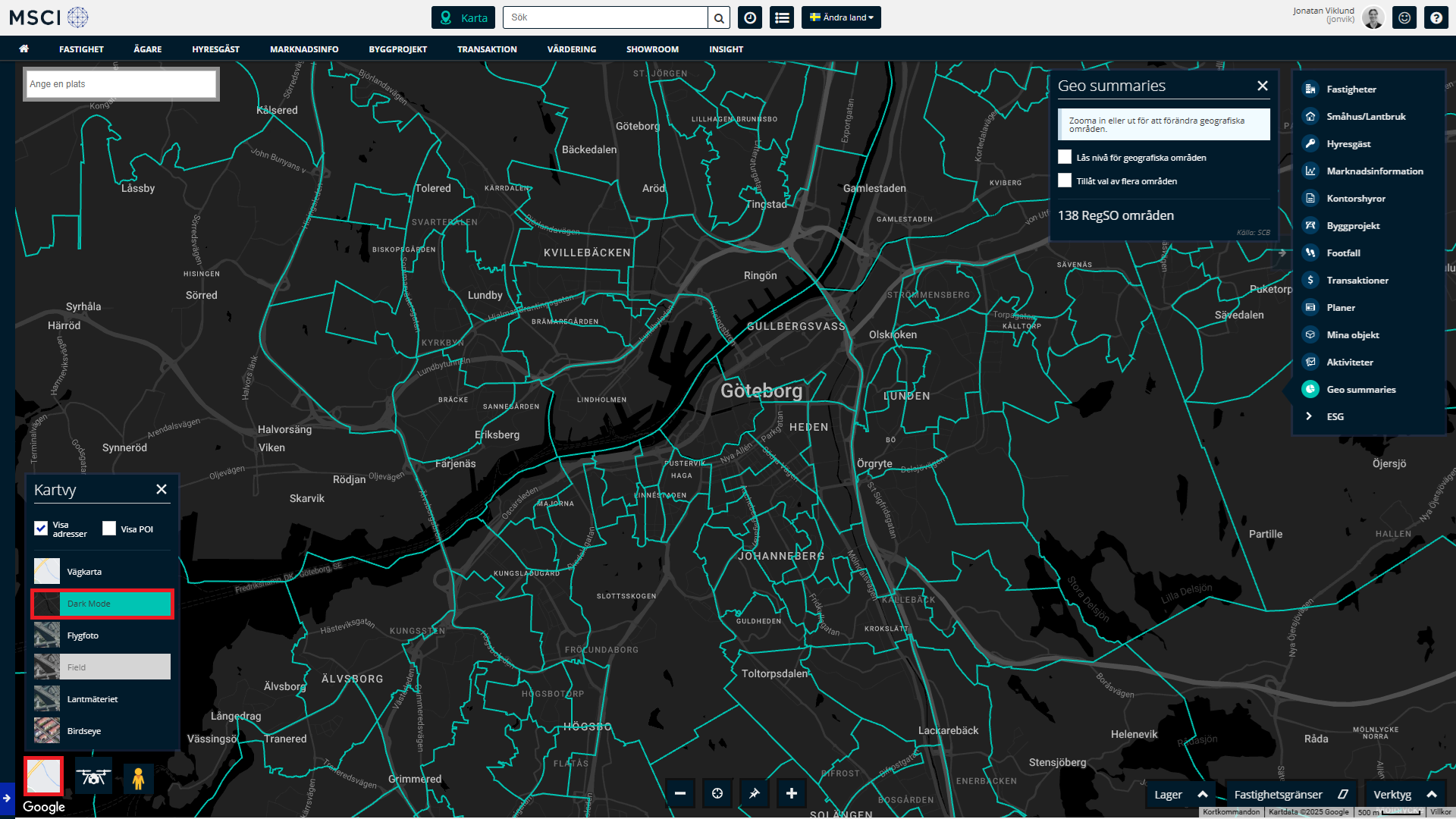 Tips! När du har tänt upp Geo summaries, kan det vara värdefullt att gå ner till det vänstra hörnet av kartan och utforska alternativa kartvyer. I vissa fall blir områdesfördelningen betydligt tydligare om du till exempel väljer dark mode, som ger starkare kontraster, istället för att använda en vanlig vägkarta eller flygfoto.