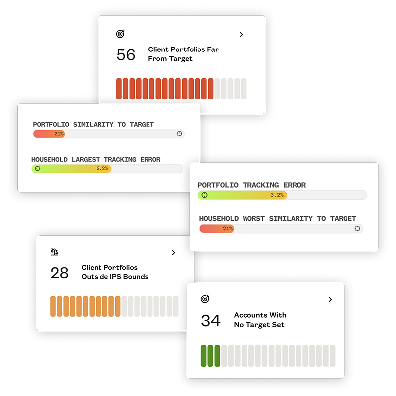Monitor deviations between house view, client targets and actual portfolios. Identify misaligned portfolios and drill down into specific reasons to take corrective action efficiently.