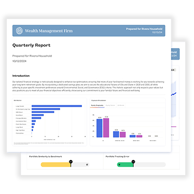 Monitor portfolio alignment with target models, run stress tests and generate tailored reports to communicate risk and performance to clients.