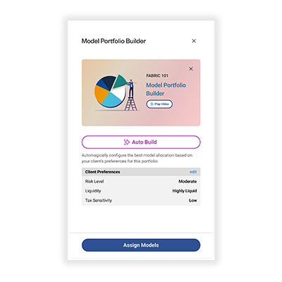 Learn moreDistribute firm-wide strategies directly within advisor workflows to ensure portfolio consistency. Enable advisors to build client portfolios using house view models and approved funds.