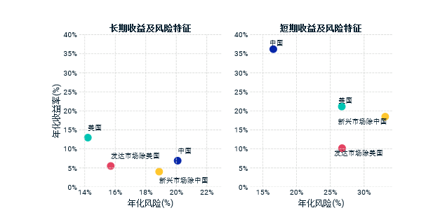 我们首先以MSCI中国指数为样本,考察中国与其他区域股票市场之间的关系。下图显示,在较短的采样时间(2019年12月至2020年12月)和较长的采样时间(2009年12月至2020年12月)中,MSCI中国指数的表现均优于MSCI新兴市场(不含中国)指数和MSCI发达市场(不含美国)指数,尽管其在较长时期内风险较高。此外,尽管MSCI中国指数在较长采样期内的表现逊于MSCI美国指数,但前者在较短采样期内表现优于美国指数且风险较低。