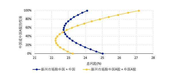 如下图所示,我们发现,在专门的中国和中国A股计划中,将大约60%的股票配置到MSCI中国指数或将30%的股票配置到MSCI中国A股指数,即可为新兴市场投资组合实现最低的事前总风险。对比来看,截至2020年12月31日,中国和中国A股在MSCI新兴市场指数中的权重分别为39.1%和4.8%。