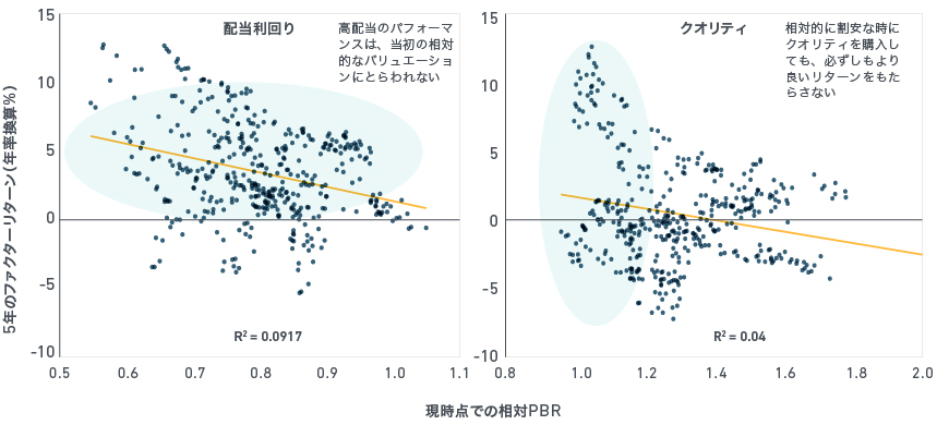 まず、ファクター自身の固有の特性によりバリュエーションには一定の傾向がある。バリューや高配当利回りはしばしば市場に対してディスカウントで取引をされている。一方で、クオリティやモメンタムは、プレミアムで取引される傾向がある。