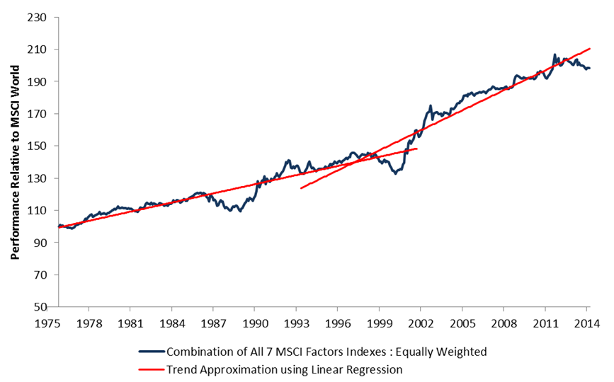 While not indicative of future performance, back-tested data indicated that when we combined all seven equally weighted MSCI factor indexes since 1975, performance did not diminish during the 40-year period, as shown in the below graph.