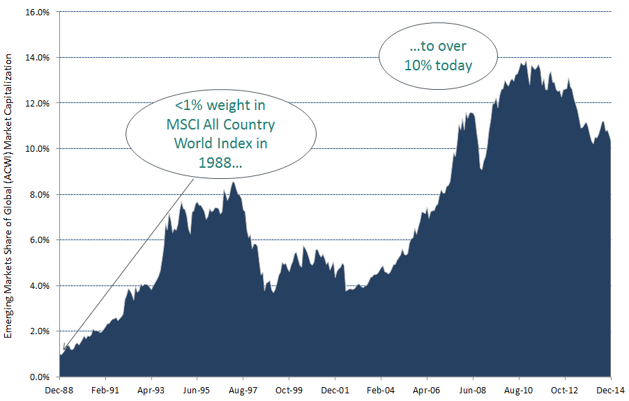Since MSCI introduced its Emerging Markets Index in 1988, the weight of emerging markets in the MSCI ACWI Index has grown from less than 1% to more than 10% at the end of 2014 (see exhibit below). That figure would have been close to 30% if emerging markets were weighted by their economic weight instead of their market weight. In addition, as economies mature, their levels of GDP per capita tend to rise and domestic companies turn increasingly to stock markets to finance their expansion, thus boosting the presence of emerging markets in the MSCI ACWI Index. The risk, of course, is that the globalization trend may reverse.