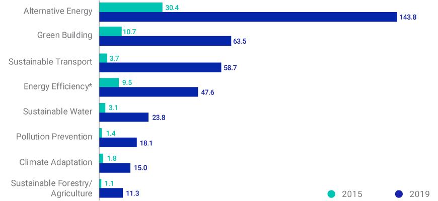 Meanwhile, we saw increasing innovation in this market. In 2019, we began to see funding directed outside the traditional buckets of alternative energy, energy and water efficiency, pollution prevention or green buildings to support “transition” projects, as well as bonds linked to specific targets or that aim to boost market liquidity.