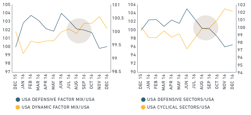 While the Brexit vote created huge uncertainty in markets, particularly in Europe, the election of Donald J. Trump and an upbeat assessment by the Fed had an opposite effect: Institutional investors shifted their strategies toward U.S. companies that benefit from economic growth and away from minimizing risk. Money followed investor sentiment in primarily three ways: from defensive to cyclical sectors, from large-cap to small-cap stocks, and from defensive to cyclical (dynamic) factors. Our findings shed light on allocations across sectors, factors and the rest of the investment spectrum.