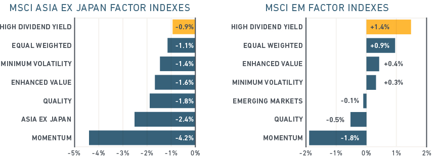 As we highlighted in a recent post, minimum volatility strategies have outperformed this year to date amid unrest in financial markets. At the same time, institutional investors may have paid less attention to the fact that the MSCI High Dividend Yield factor indexes have turned in a stellar performance in emerging markets and Asia ex Japan.