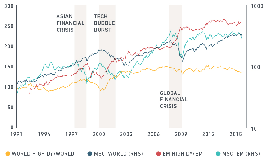 Relative performance of High Dividend Yield factors in developed and emerging markets