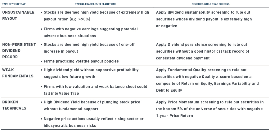 To help investors avoid so-called yield traps, the MSCI High Dividend Yield Indexes apply four screens that aim to lessen the risk of stocks at risk of cutting future payouts (table below).