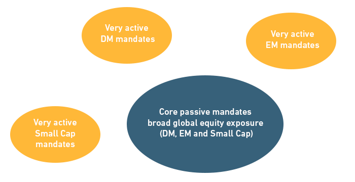 For a global equity allocation that spans developed and emerging markets and includes small caps, one possible core-satellite structure would combine passive and very active mandates in each of these equity market segments. Core passive mandates offer broad global equity exposure, and the very active mandates reflect the investor’s conviction in active management and skills in selecting active managers.