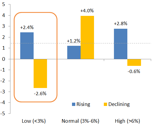 Contrary to the conventional wisdom that investors should hunt for yield in a declining or low interest rate environment, such regimes have historically coincided with low active returns for high dividend-yielding strategies. Rather, we found that the yield factor has tended to perform well during a structurally low and rising interest rate regime, as can be seen in the below exhibit. This could become a prevailing macroeconomic regime over the coming years as the Federal Reserve begins its rate-hiking cycle.