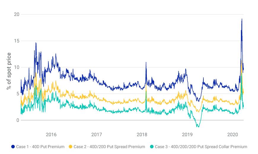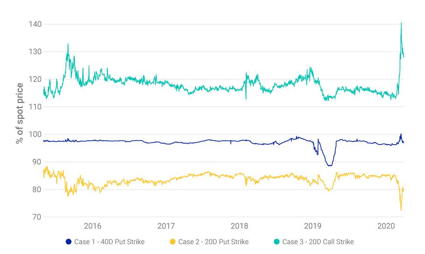- While the premium of outright constant-delta put options rose with market volatility, we show the premium of put-spread collars had less sensitivity to volatility. Option volumes linked to MSCI indexes grew 14% in Q1 2020 vs. Q1 2019.