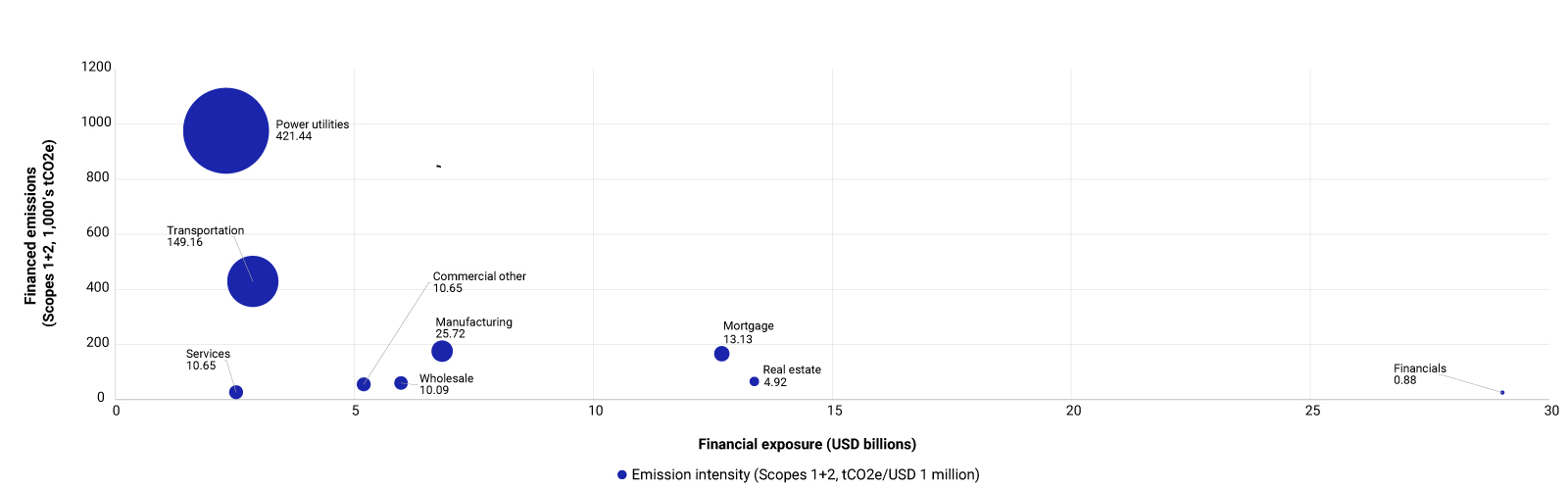 Financed emissions vs. loan size and emissions intensity across sectors in the loan book